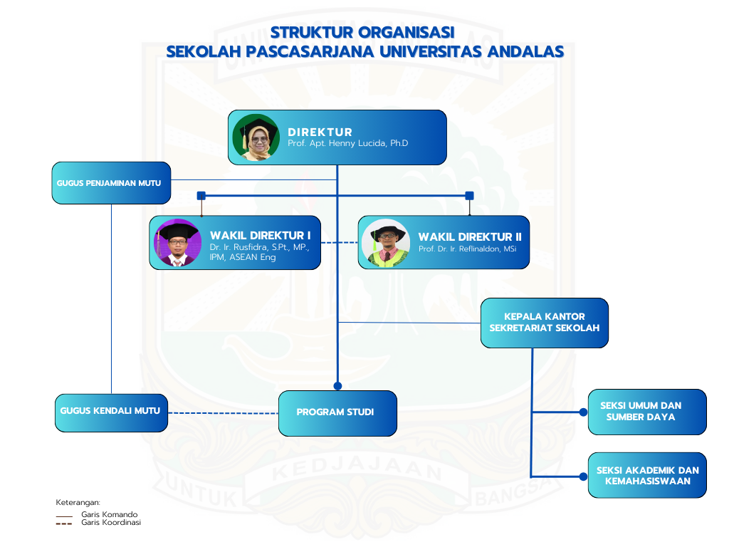 Sekolah Pascasarjana memiliki struktur organisasi yang dirancang untuk memberikan layanan akademik berkualitas tinggi. Dipimpin oleh seorang Direktur yang dibantu oleh Wakil Direktur, manajemen kami fokus pada pengembangan program multidisiplin magister dan doktoral unggulan. Tugas dan fungsi manajemen yang dilakukan SPs UNAND diatur dalam Peraturan Rektor Nomor 8 tahun 2022 tentang Organisasi dan Tata Kerja Organ Pengelola Universitas Andalas.