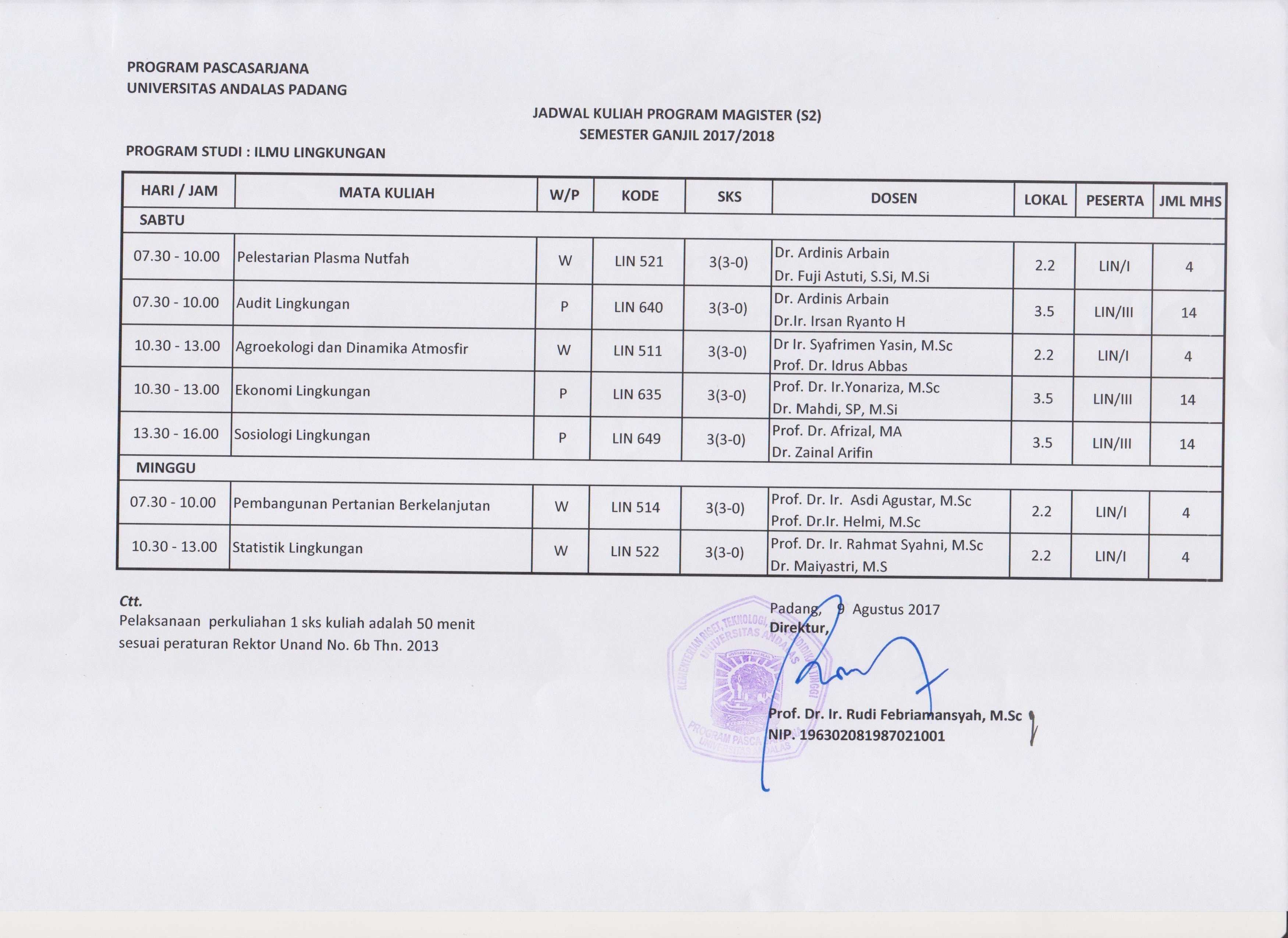 Jadwal Kuliah Program Magister (S2) Ilmu Lingkungan Semester Ganjil 2017/2018