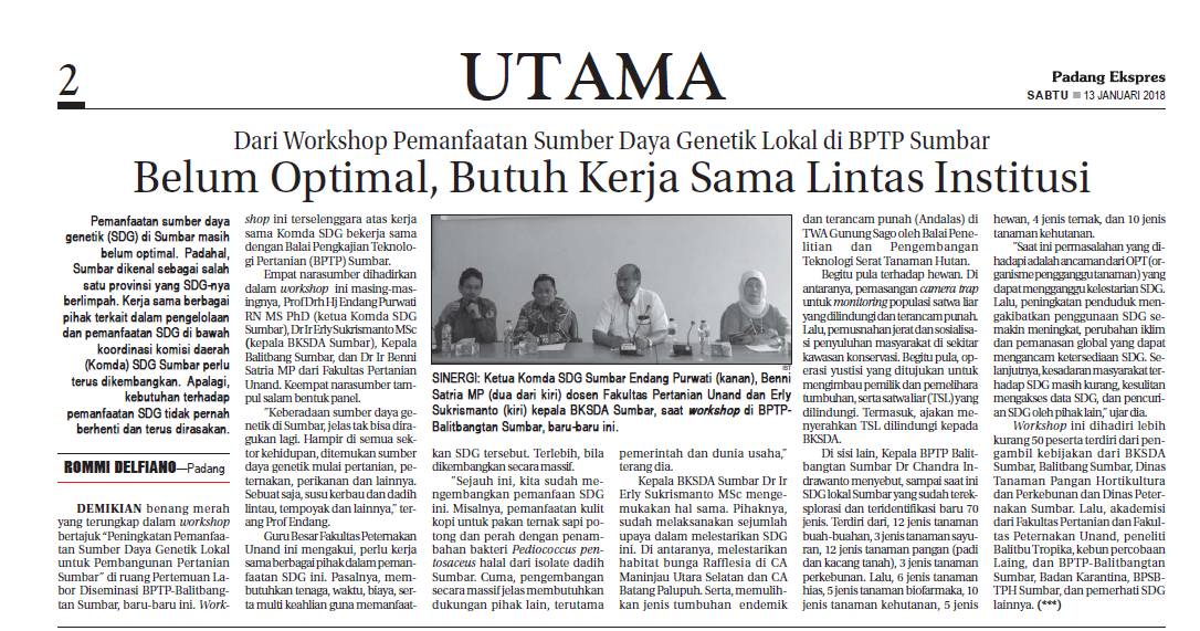 Kepala BPTP Balitbang Sumbar Dr. Chandra Indrawanto menyebut, sampai saat ini SDG lokal Sumbar yang sudah tereksplorasi dan terindetifikasi baru 70 jenis, terdiri dari 12 jenis tanaman buah-buahan, 3 jenis tanaman sayuran, 12 jenis tanaman pangan(pad dan kacang tanah), 3 jenis tanaman perkebunan, 6 jenis tanaman hias, 5 jenis tanaman biofarmaka, 10 jenis tanaman kehutanan, 5 jenis hewan, 4 jenis ternak dan10 jenis tanaman kehutanan.