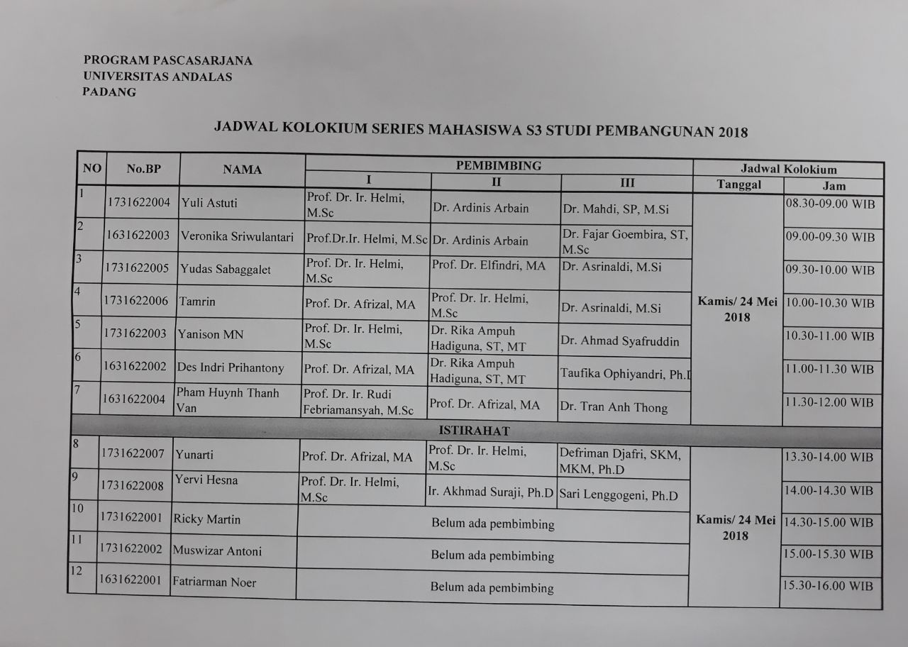Jadwal Kolokium Series Mahasiswa S3 Studi Pembangunan Program Pascasarajana Universitas Andalas