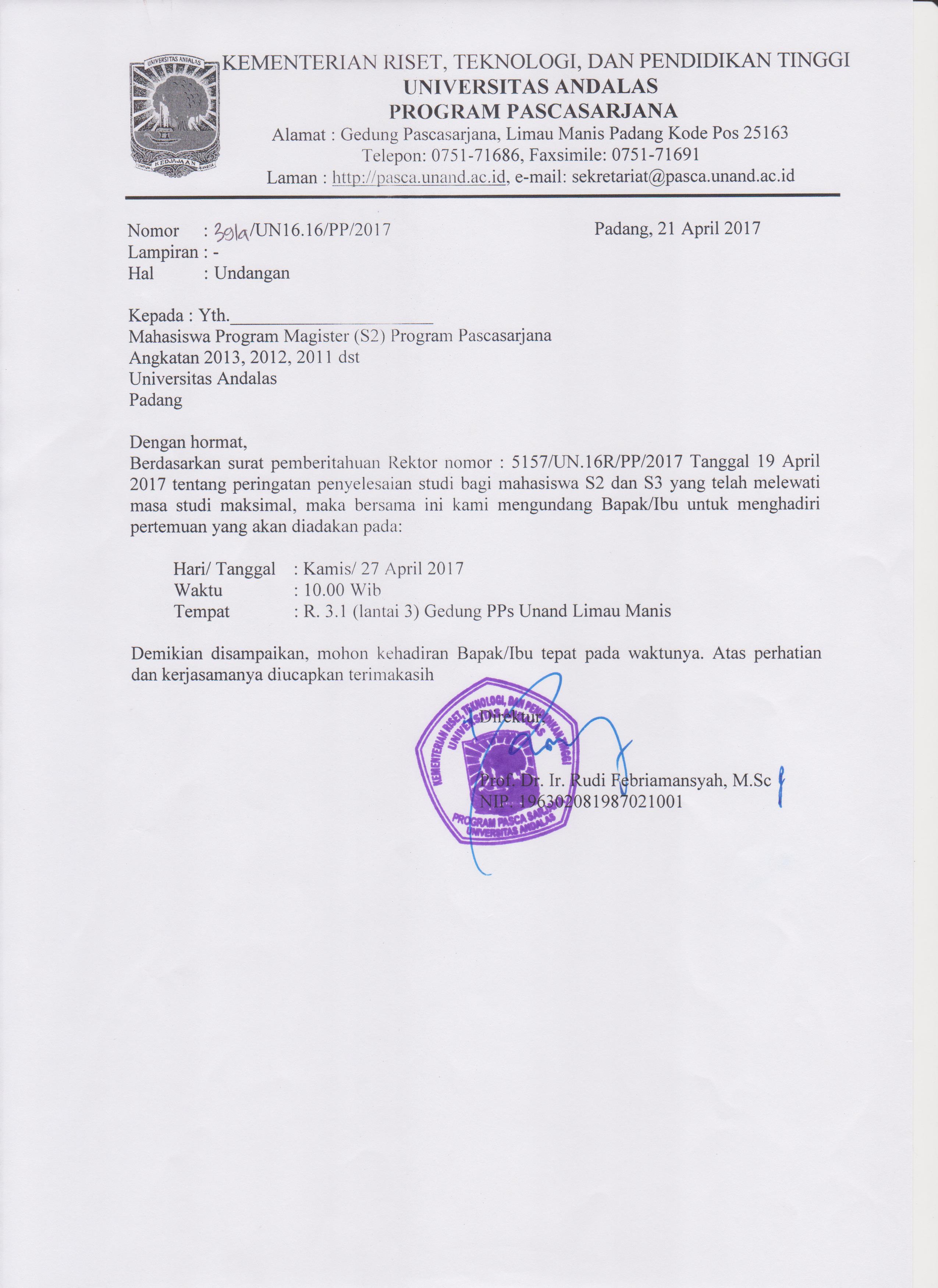 Berdasarkan surat pemberitahuan Rektor nomor : 5157/UN.16R/PP/2017 Tanggal 19 April 2017 tentang peringatan penyelesaian studi bagi mahasiswa S2 dan S3 yang telah melewati masa studi maksimal, maka bersama ini kami mengundang Bapak/Ibu untuk menghadiri pertemuan yang akan diadakan pada :