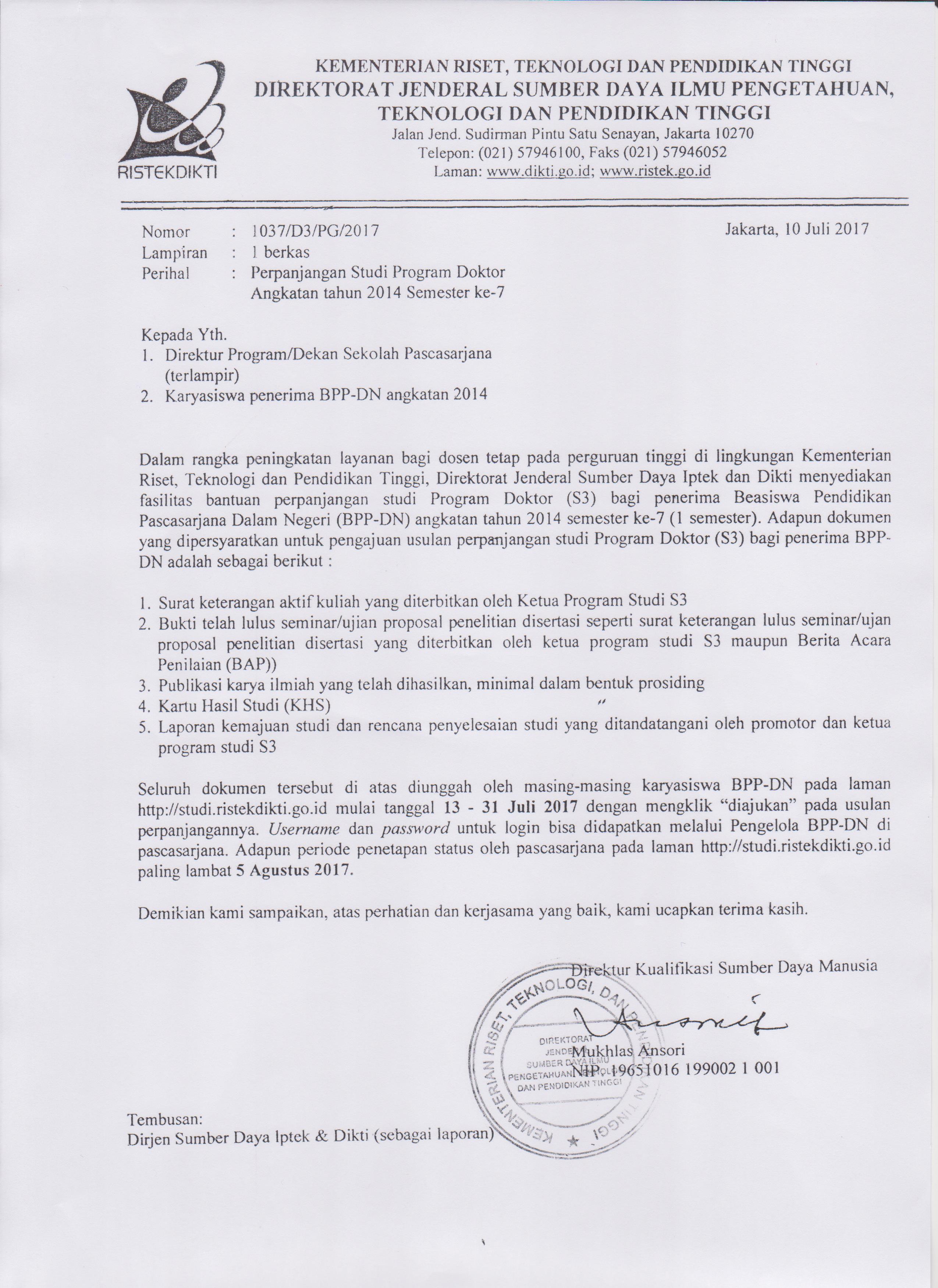 Dalam rangka peningkatan layanan bagi dosen tetap pada perguruan tinggi di lingkungan Kementerian Riset, Teknologi dan Pendidikan Tinggi, Direktorat Jenderal Sumber Daya Iptek dan Dikti menyediakan fasilitas bantuan perpanjangan studi Program Doktor (S3) bagi penerima Beasiswa Pendidikan Pascasarjana Dalam Negeri (BPP-DN) angkatan tahun 2014 semester ke 7 (semester 1). Adapun dokumen yang harus dipersyaratkan untuk pengajuan usulan perpanjangan studi Program Doktor (s3) bagi penerima BPP-DN adalah sebagai berikut :