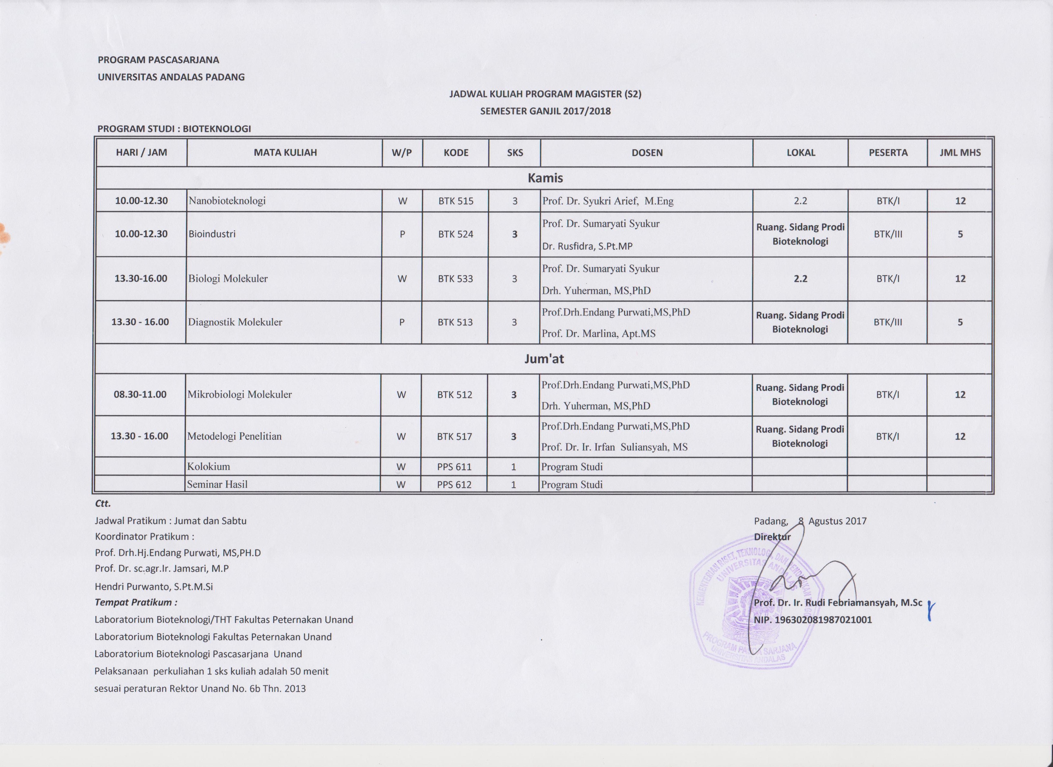 Jadwal Kuliah Program Magister (S2) Bioteknologi Semester Ganjil 2017/2018